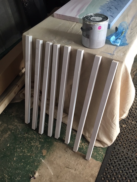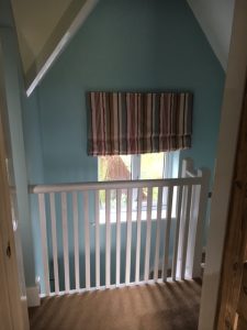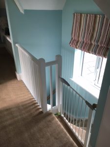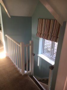The gaps between the railings at the top of the stairs didn’t seem to meet any modern safety standards. Although his head probably wouldn’t have fit through, we were pretty terrified Jude would slip through feet first and get his head caught, so this was a priority. Barry got some square wooden dowels that were pretty similar to what was already there, cut them to size, and then I painted them. He fixed them in place (wow, nail guns are loud!), filled in the gaps with wood filler, and then I painted over the whole lot again with white eggshell paint. Ignore the blind. We don’t like the blind.